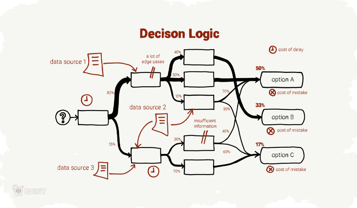 So we took advantage of the high lord’s attention and worked out the details of the business decision that our Quest would serve. We found out the main purpose of our research — the “Decision-to-be-Made”. We mapped out the decision logic, identified the available sources of data and the reasons for possible difficulties, and also got an idea of how to evaluate the quality of the resulting options.